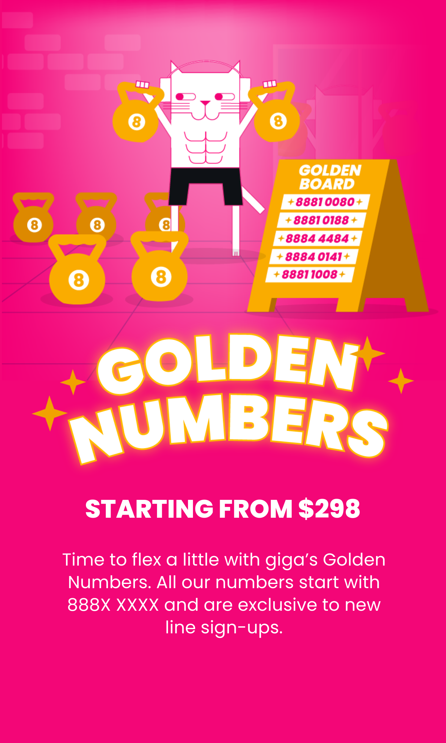 Time to flex a little with giga’s Golden Numbers. All our numbers start with 888X XXXX and are exclusive to new line sign-ups.